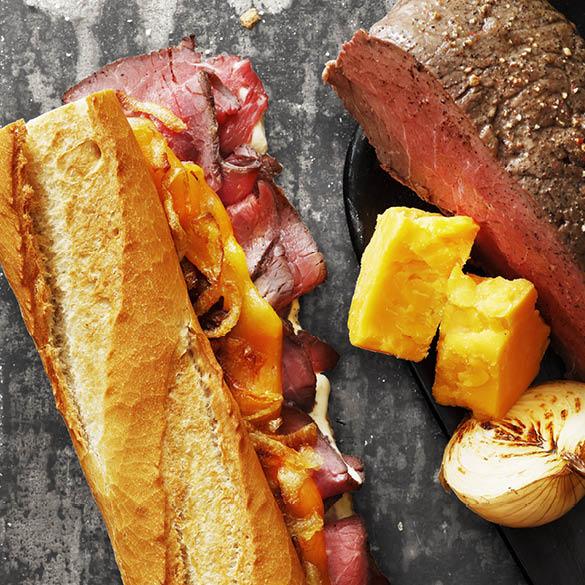 Dvojitá porce roastbeefu, křenový dresink, grilovaná cibulka, čedar