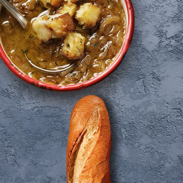 Hustá francouzská cibulová polévka s tymiánem, kousky kuřecího masa, bramborami a mrkví